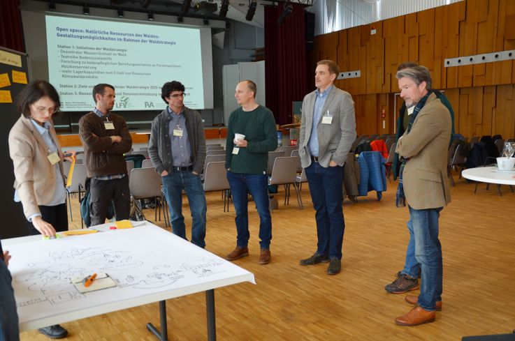 An zwei Terminen haben insbesondere die Mitarbeiterinnen und Mitarbeiter der Landesforstverwaltung und der AöR ForstBW die Möglichkeit, sich im Rahmen der internen Waldgespräche aktiv in die Weiterentwicklung der Waldstrategie einzubringen: